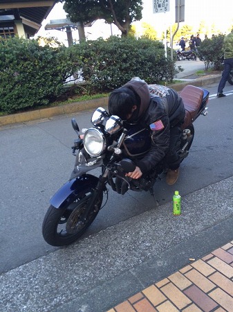 さて、次にチームメンバーの青金ZRXの岡君がやっとブレーキディスクを交換しました!(笑)